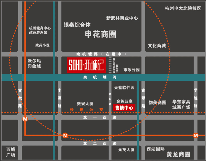 SOHO西城纪北依城市级主干道路——即将开通的余杭塘路,双向6车道,向东连通规划中的香积寺路横贯杭州城市东西部,成为通达杭州东、西部的交通大动脉,有效聚合城东的交通中转大枢纽能量及城西的创智产业及高端商业资源,交通便利。
