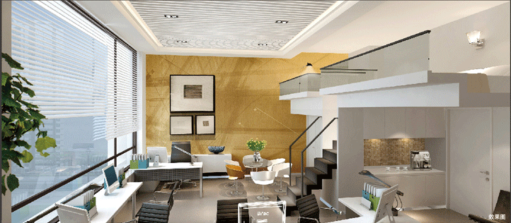 精巧版经典复式户型,专为个性的SOHO一族度身订制。入口布置接待区,茶水间、文印区、储藏间、卫生间集合服务功能空间于一层,保证与办公创意空间的动静分区。工作区与主管区享4.2米挑高空间,方正开敞,正对小区中央花园,拥享绿意盎然的生态活性景观;二层设独立休憩室及活动室,人性化提供员工放松之所;或可设计为展示与样品陈列区,空间虽小,功能齐备。