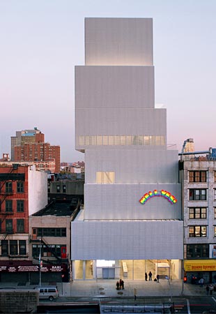 于2007年投入使用的纽约新当代艺术博物馆第二年被康德-纳斯特誉为建筑七大奇迹之一。该博物馆就像一个分层的婚礼蛋糕,其内部也陈列了很多当代的艺术作品。