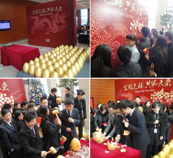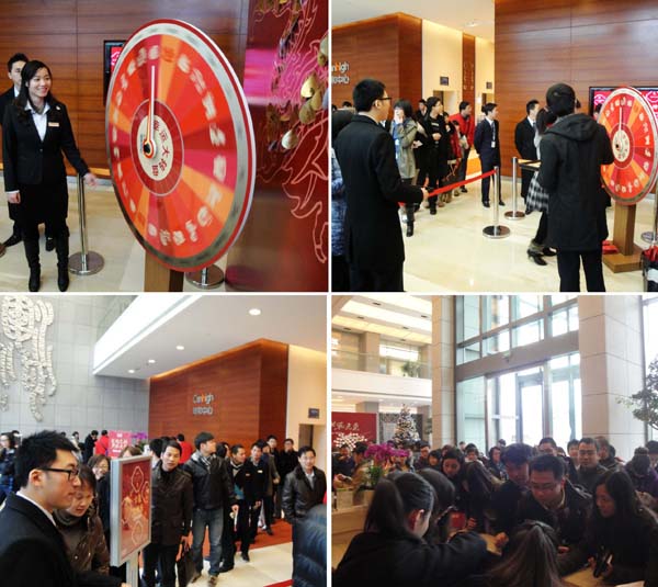 坤和中心领导先贴龙鳞,开启龙头,致辞祝福新年。每家租户企业代表领取一张“金龙鳞”,将写好祝福的“金龙鳞”贴到背景墙龙头的位置,之后开始进行砸金蛋活动赢取奖品,共同开启龙年鸿运。当天66颗金蛋全部砸完之后,龙年系列活动正式展开,大转盘揭幕,“新年幸运大转盘”活动于次日开启。