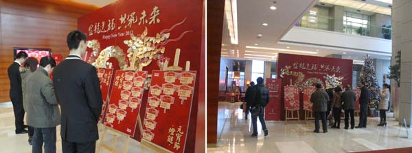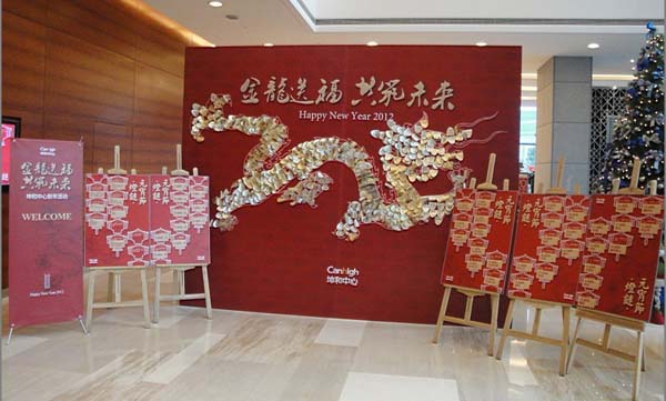 坤和中心“金龙送福 共筑未来”新年系列活动也随着元宵灯谜活动的结束而圆满落幕。写字楼大堂的龙形图案上贴满了客户们的祝福金龙鳞,金色的龙鳞与灯光交相辉映,预示着2012红红火火的崭新的一年,祝福坤和中心及租户“龙腾虎跃 大展宏图”。