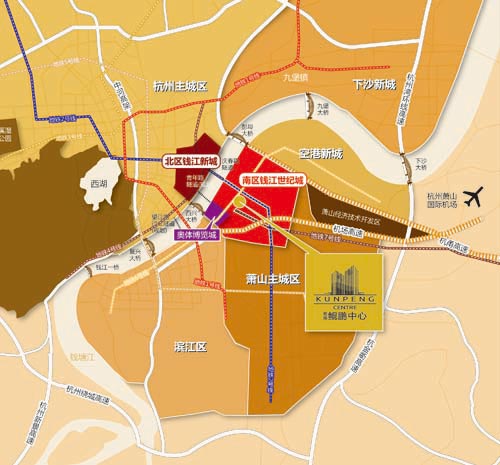 宏扬鲲鹏位于钱江世纪城中央区,是大杭州都会经济中首屈一指的“双十字”核心圈——江北“庆春路”-江南“市心路”商务大动脉与机场高速路形成第一个黄金十字;而即将贯穿全城的地铁二号线与钱塘江南岸东西主动脉——江南大道形成第二个十字交叉,目前已有宏扬鲲鹏中心、人民日报浙江总部等进驻,这里巧妙嫁接江南与江北、江东与滨江,轻松辐射全城,是企业家们高端商务的上上之地!
