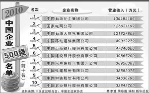 9月4日,一年一度的中国企业500强名单在合肥新鲜出炉,中石化以1.39万亿元的营业收入继续蝉联2010年中国企业500强名单的榜首。受国际金融危机和经济刺激政策的双重影响,2010年中国企业500强入围门槛由上年的105.4亿元提高到110.8亿元,但提高幅度继续下降。中石化、国家电网、中石油前三强营业收入额共约3.86万亿元,占500强收入总额的近14%。而排名最前的一家民营企业华为技术有限公司,位居第37位。