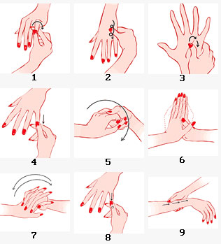 6.揉指:用拇指与食指夹揉按摩手指,从指根到指尖。能促进血液循环和体表温度。