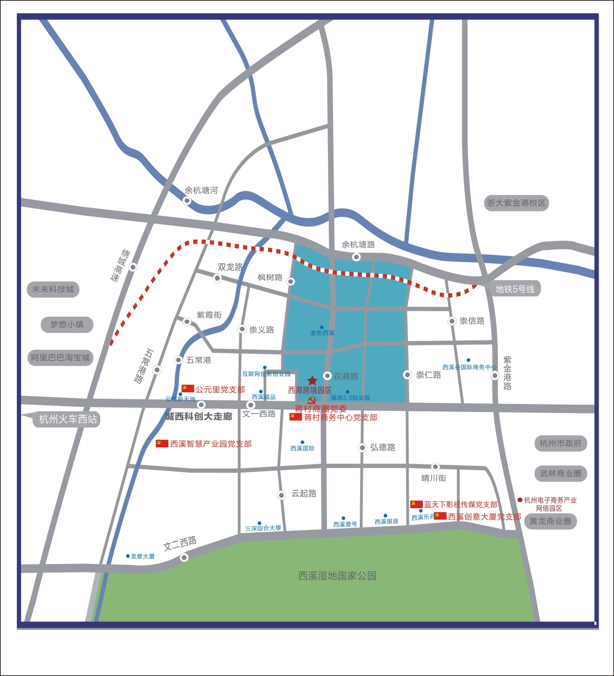 蒋村商务中心所在地为杭州城西地段,地处杭州“硅谷”城西科创大走廊主轴文一西路与蒋村商圈商业主轴花蒋路交汇处,北依浙大紫金港校区,南拥西溪国家湿地公园,东临黄龙国际商圈,西邻阿里巴巴西溪园区,未来科技城和杭州火车西站。