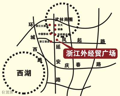 浙江外经贸广场立足杭州武林CBD(中央商务区)区内,位于延安路凤起路交叉口,1号线地铁凤起路站出口,南临凤起路,西接延安路,东为金都杰地大厦。坐享武林商圈繁华配套,周边公交线路密集,商务通道便捷,配套完整齐全,四周云集各大银行、购物中心、宾馆饭店,是优选的办公空间。