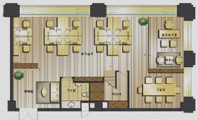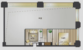 精巧版经典复式户型,专为个性的SOHO一族度身订制。入口布置接待区,茶水间、文印区、储藏间、卫生间集合服务功能空间于一层,保证与办公创意空间的动静分区。工作区与主管区享4.2米挑高空间,方正开敞,正对小区中央花园,拥享绿意盎然的生态活性景观;二层设独立休憩室及活动室,人性化提供员工放松之所;或可设计为展示与样品陈列区,空间虽小,功能齐备。